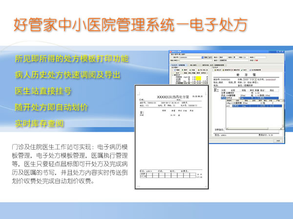 本系統(tǒng)集成了門診掛號(hào)、劃價(jià)收費(fèi)管理、藥庫藥房管理、住院管理系統(tǒng)、財(cái)務(wù)、統(tǒng)計(jì)管理等各主要環(huán)節(jié);新推出的增強(qiáng)版更是增加了門診住院醫(yī)生工作站、電子病歷編輯器、護(hù)士工作站、電子病歷、電子處方等強(qiáng)大的功能;更可配套我們的《好管家診療影像管理子系統(tǒng)》實(shí)現(xiàn)醫(yī)療影像診斷報(bào)告在各個(gè)醫(yī)生工作站之間共享。系統(tǒng)擁有強(qiáng)大的院長查詢管理、各類報(bào)表統(tǒng)計(jì)功能、藥品門店零售(POS)管理、住院病人費(fèi)用及電子病歷情況;同時(shí)可擴(kuò)展城鎮(zhèn)職工醫(yī)療保險(xiǎn)接口及新農(nóng)村合作醫(yī)療管理接口并已經(jīng)有許多客戶成功定制; 如需OEM指定版本請(qǐng)聯(lián)系我們。